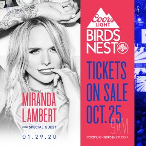 Two-time GRAMMY Award winner and nine-time Academy of Country Music Female Vocalist of the Year Miranda Lambert will kick off the Coors Light Birds Nest on Wed., Jan. 29, bringing her feisty, down-home personality and stellar vocals to the stage. Lambert is currently promoting The Wildcard Tour, named for Lambert’s November 1 seventh-studio album designated one of the “most anticipated albums of Fall 2019” by Billboard, featuring 27 dates across several major markets throughout the U.S. and Canada. Lambert’s first six studio albums were certified platinum and produced hit singles such as “House that Built Me,” “Heart Like Mine,” “Over You,” and “Somethin’ Bad” (featuring Carrie Underwood), all of which hit the No. 1 position on Billboard’s Hot Country Songs.