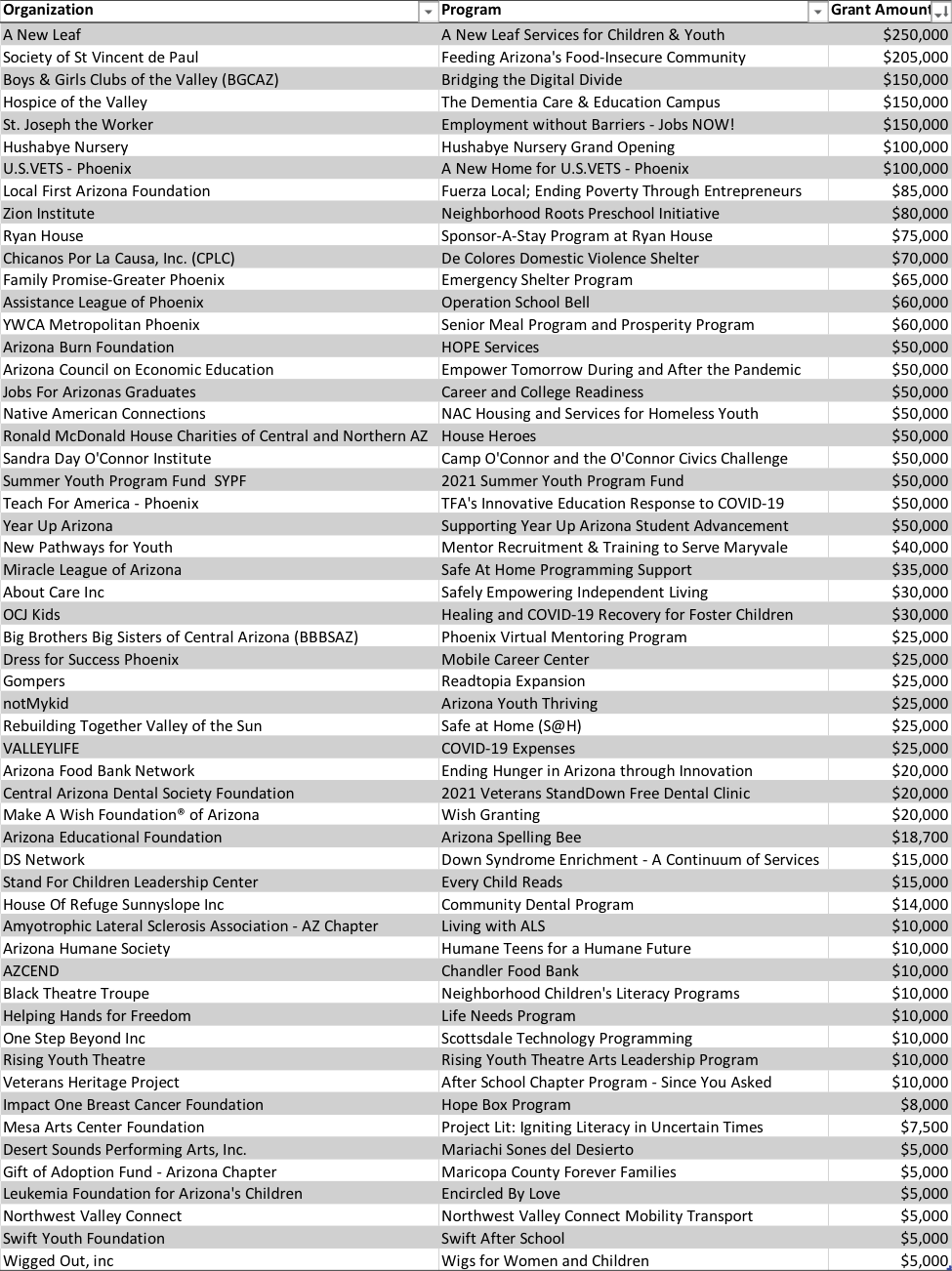 Thunderbirds Charities, the charitable giving arm of The Thunderbirds – hosts of the Waste Management Phoenix Open – awarded more than $2.5 million in grants to 56 Valley charities during its 2020 fall funding cycle. Thunderbirds Charities awarded grants of $100,000 or more to seven Valley Charities that included $250,000 to A New Leaf, $205,000 to Society of St. Vincent de Paul, $150,000 to Boys & Girls Clubs of the Valley, and $150,000 to Hospice of the Valley.