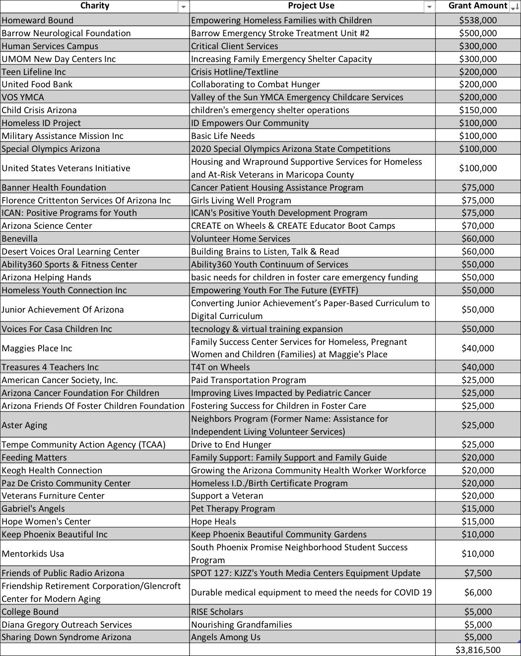 Keeping with their mission to support local non-profit organizations here in the Valley, Thunderbirds Charities – the charitable giving arm of The Thunderbirds – awarded more than $3.8 million in grants to 43 Valley charities during its 2020 spring funding cycle.